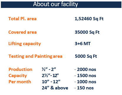 Our manufacturing plant is equipped with CNC machines, Lathe machines, welding facility for hard facing (stellite), special purpose machines and grinding/lapping.